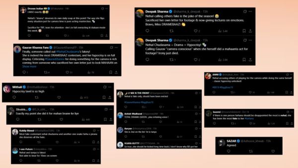 One viewer wrote, “Finally, someone called out #NehalChudasama’s fakery! She is indeed the most DRAMEBAAZ contestant, and her hypocrisy is on full display. Criticizing #GauravKhanna for doing something for the camera is rich coming from someone who sacrificed her own letter just to look MAHAAN on screen and gain sympathy. It’s pure overacting!”